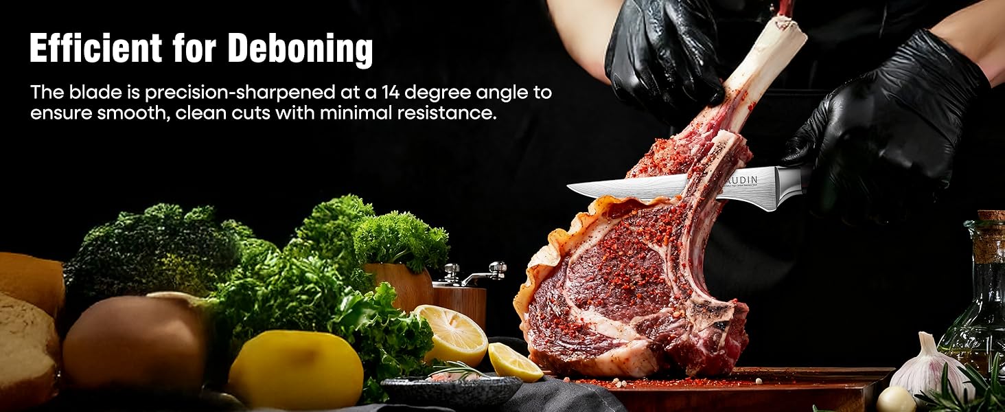 The PAUDIN 6-inch boning knife features a razor-sharp, hand-honed German high carbon stainless steel blade with 56+ Rockwell Hardness for exceptional durability and precision. Its ergonomic pakkawood handle ensures a comfortable, balanced grip, making it ideal for deboning, filleting, and trimming meat and poultry. Packaged in a stylish gift box, this professional-grade knife is perfect for home cooks and culinary enthusiasts seeking efficiency and style.