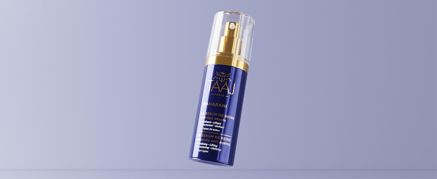 TAAJ The Queen's Serum - MAHARANI is a 30ml ultra-concentrated anti-ageing serum combining 40 rare natural ingredients with hyaluronic acid, marine collagen, and elastin. Developed in France using pure Himalayan spring water, it deeply regenerates mature skin, lifts facial features, and evens complexion with 97% natural actives, delivering visibly younger, plumped skin.