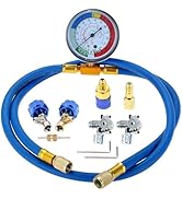 The R134A Car AC Refrigerant Charge Hose Kit is a professional-grade tool designed for seamless recharging of vehicle and home air conditioning systems. Featuring a universal 1/2 inch ACME thread compatible with R134A, R12, and R22 refrigerants, it boasts a durable aluminum and brass build with a built-in safety valve to prevent accidental leaks. The included gauge ensures precise pressure measurement, while the 90-degree push & lock coupler with auto shut-off guarantees easy, mess-free operation. This 15.4-inch hose kit is the ultimate upgrade for any AC maintenance toolkit.