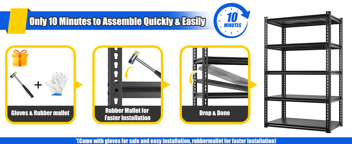 The REIBII Garage Shelving is a heavy-duty, 5-tier metal storage solution measuring 72"H x 36"W x 18"D, designed to hold up to 2500 lbs. Featuring adjustable shelves in 1.4" increments, a powder-coated finish for durability, and safety enhancements like anti-tipping kits and rubber footpads, it transforms cluttered spaces into organized, professional-grade storage areas. Quick to assemble with a tool-free click-and-lock system, it’s perfect for garages, warehouses, basements, and more.