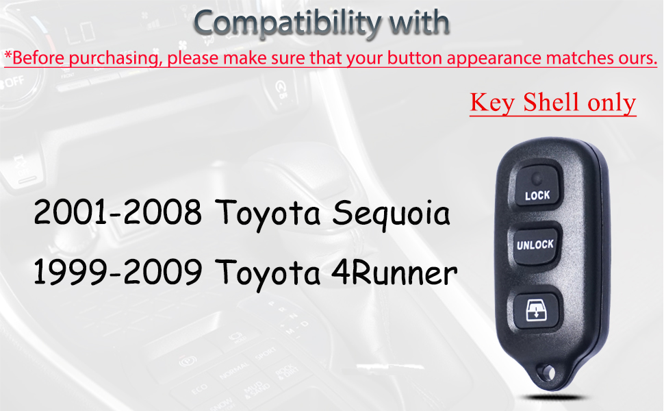 This replacement key fob shell is designed exclusively for Toyota 4Runner (1999-2009) and Sequoia (2001-2008) models. Made from durable plastic, it offers a precise fit and easy installation without the need for reprogramming. Ideal for refreshing worn or damaged key fobs, it protects your original electronics while restoring your key's sleek appearance.