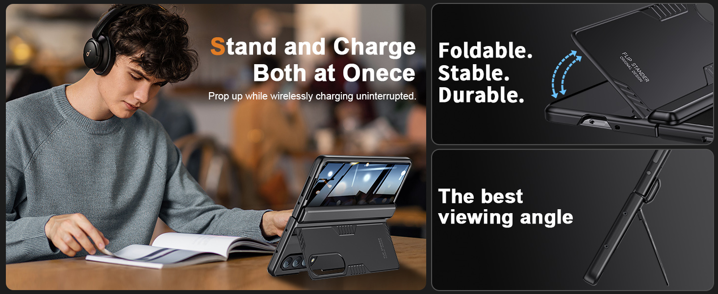 This Samsung Galaxy Z Fold 3 Privacy Case features a privacy screen protector that blocks side views, a hidden magnetic kickstand for hands-free use, and supports wireless charging without removing the case. Crafted from durable polycarbonate with a microfiber interior, it offers slim, lightweight protection tailored exclusively for the Galaxy Z Fold 3, combining security, convenience, and sleek design.