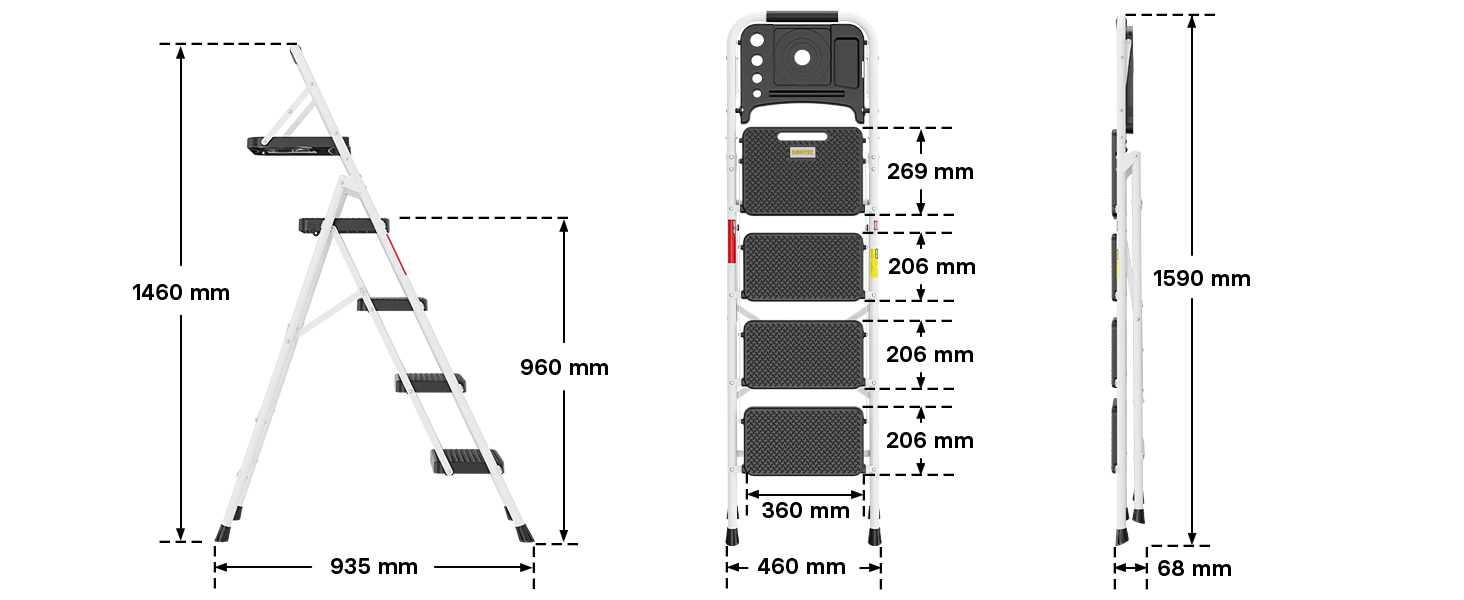 The BONTEC 4-step ladder combines heavy-duty construction with smart design, supporting up to 150kg thanks to thickened steel and metal riveting. Its foldable frame compresses to just 7cm, perfect for tight storage, while an integrated tool tray enhances efficiency. Safety features like anti-slip pedals and cushioned handrails provide secure, comfortable use indoors or outdoors. Pre-assembled for instant deployment, BONTEC is the ultimate ladder for professionals who demand durability and convenience.