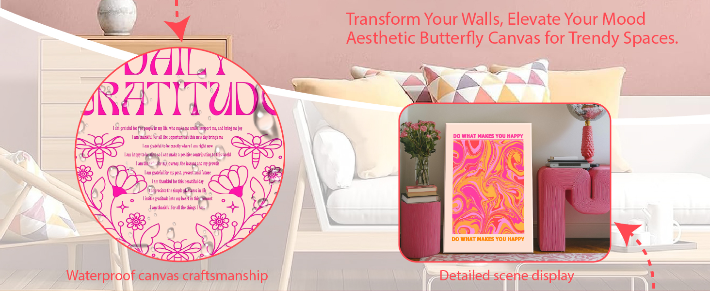 - 2. Pink Funky Wall Art Decor--- Enhance your space with a touch of elegance by using this set of three butterflies prints. Daily thanksgiving poster for living room, bedroom, kitchen, apartment, office, hotel, restaurant.