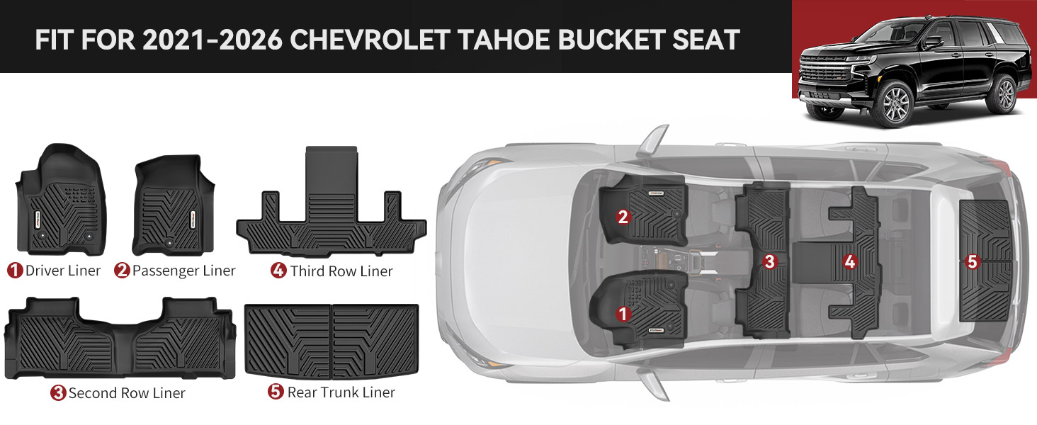 YITAMOTOR Floor Mats are precision-engineered TPE liners tailored for 2021-2026 GMC Yukon and Chevy Tahoe 7-seat models. Featuring 3D laser-measured contours, these all-weather mats provide full coverage across three rows plus cargo, combining sustainable materials with durable, slip-resistant design for year-round floor protection and easy cleaning.