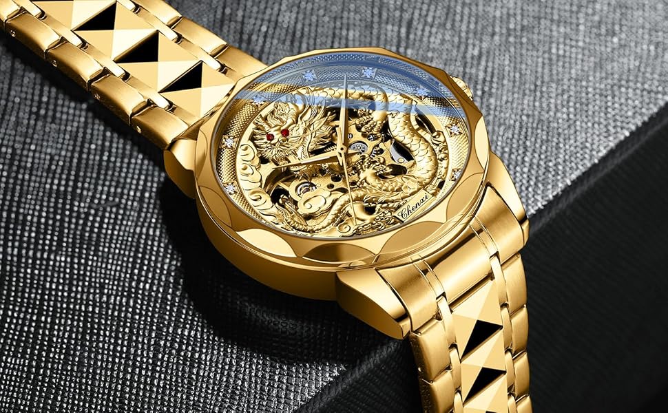 Daxiaoyuluxury Gold Mechanical Watch Men Unique Dragon Patern Dial Golden | Desertcart Japan