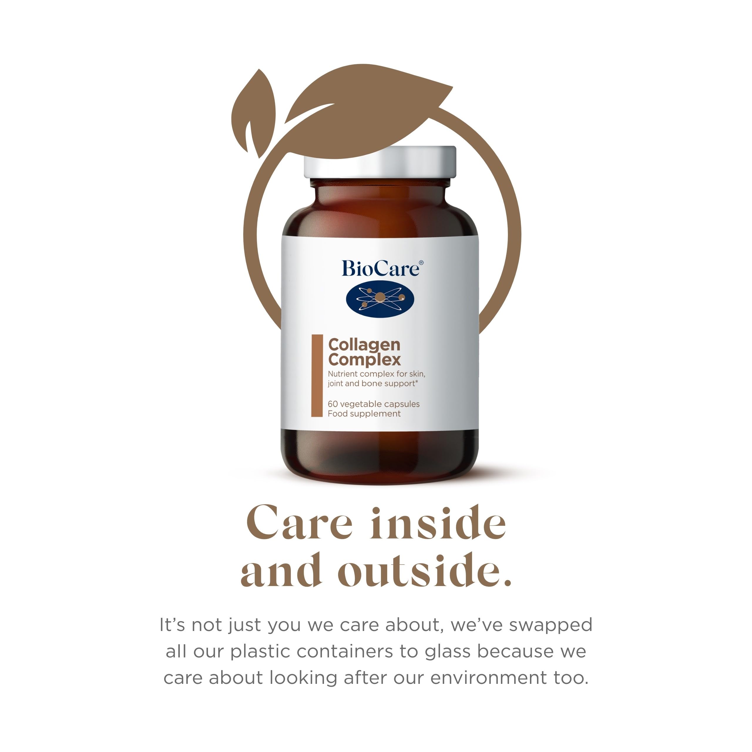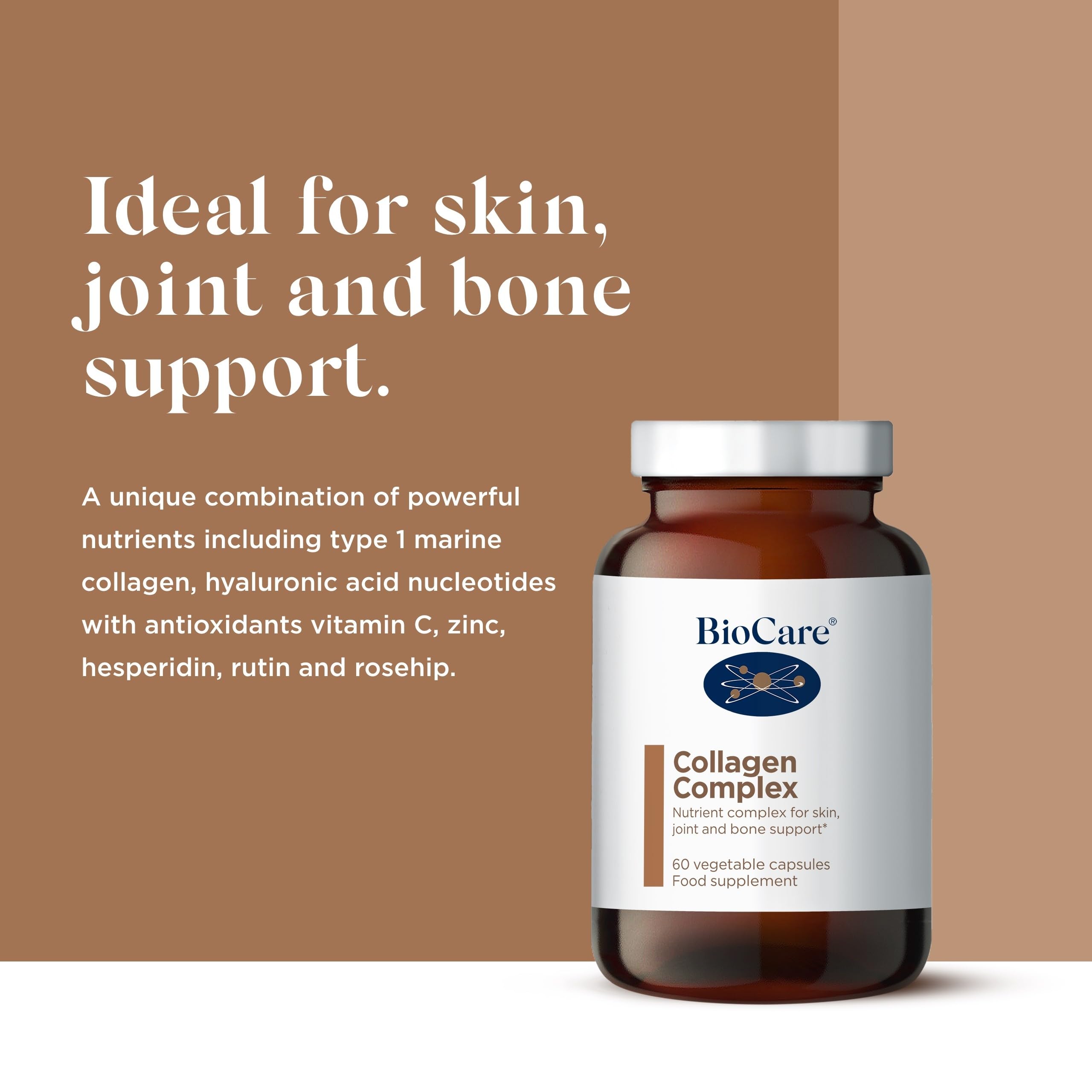 BioCare Collagen Complex combines marine collagen, hyaluronic acid, nucleotides, and antioxidants like Vitamin C and Zinc to support skin hydration, collagen formation, and cellular protection. Designed for adults, this UK-made supplement delivers 60 capsules with a recommended dose of two daily, ensuring premium quality and effective skin and bone health support.