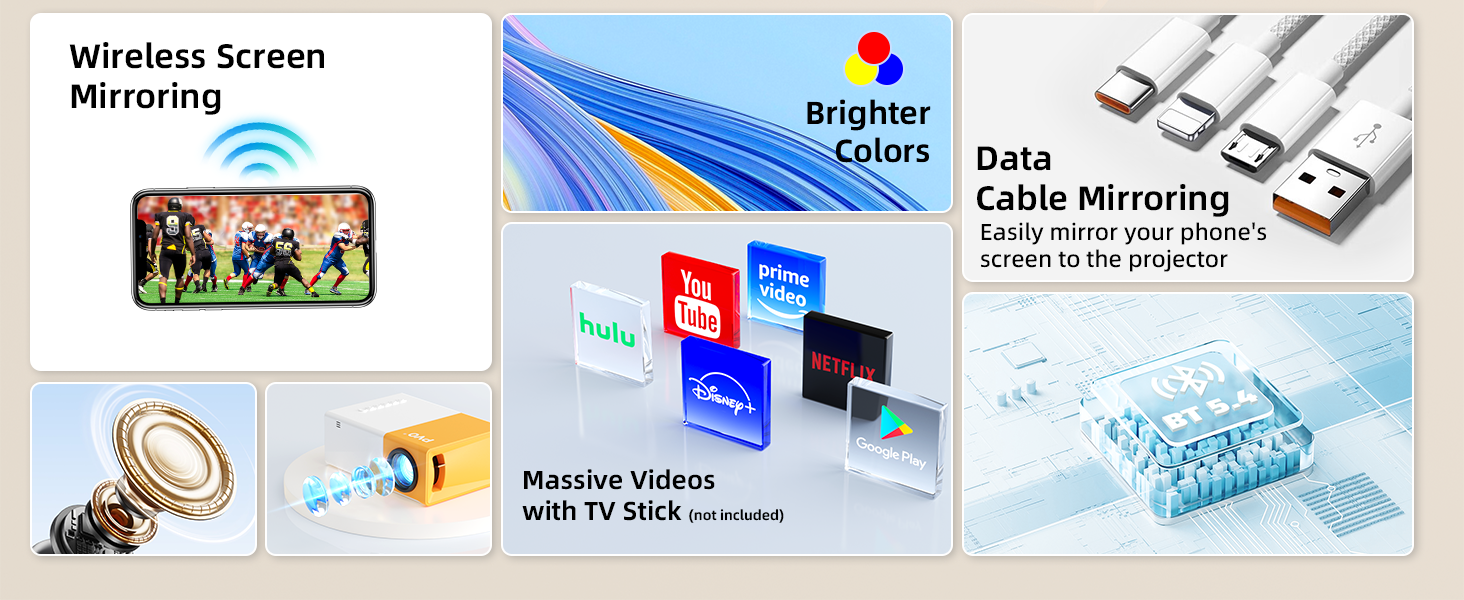 The PVO YG300ProMax is a portable 1080P Full HD projector featuring seamless WiFi and wired screen mirroring for smartphones, tablets, and laptops. Equipped with Bluetooth 5.4 for wireless audio, it delivers 60% brighter images with eye-friendly lighting. Compact and lightweight, it supports up to a 200-inch display and multiple device connections, making it the ultimate on-the-go home theater solution.