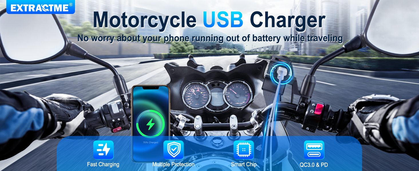 The EXTRACTME Motorcycle USB Charger delivers fast dual-device charging with 20W USB-C PD and 18W Quick Charge 3.0 USB-A ports. Featuring a real-time LED voltmeter and an independent on/off switch, it ensures battery health monitoring and safety. Its waterproof, flame-retardant design and universal SAE connector make it compatible with a wide range of 12-24V vehicles. Easy to install on handlebars or via screws, this charger is the ultimate power companion for every rider.
