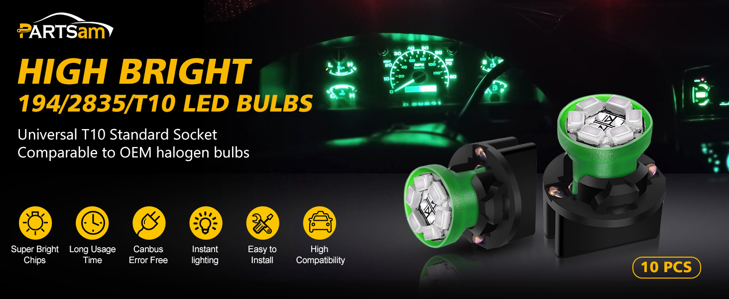 The Partsam T10 194 168 LED Dash Instrument Light Bulbs set includes 10 super bright green LED bulbs with 6-2835-SMD chipsets and twist lock sockets for secure installation. Designed for 12V systems, these bulbs offer universal T10 wedge compatibility, energy-efficient operation, and a long lifespan of up to 50,000 hours, making them an ideal upgrade for vehicle dashboards and interior lighting.