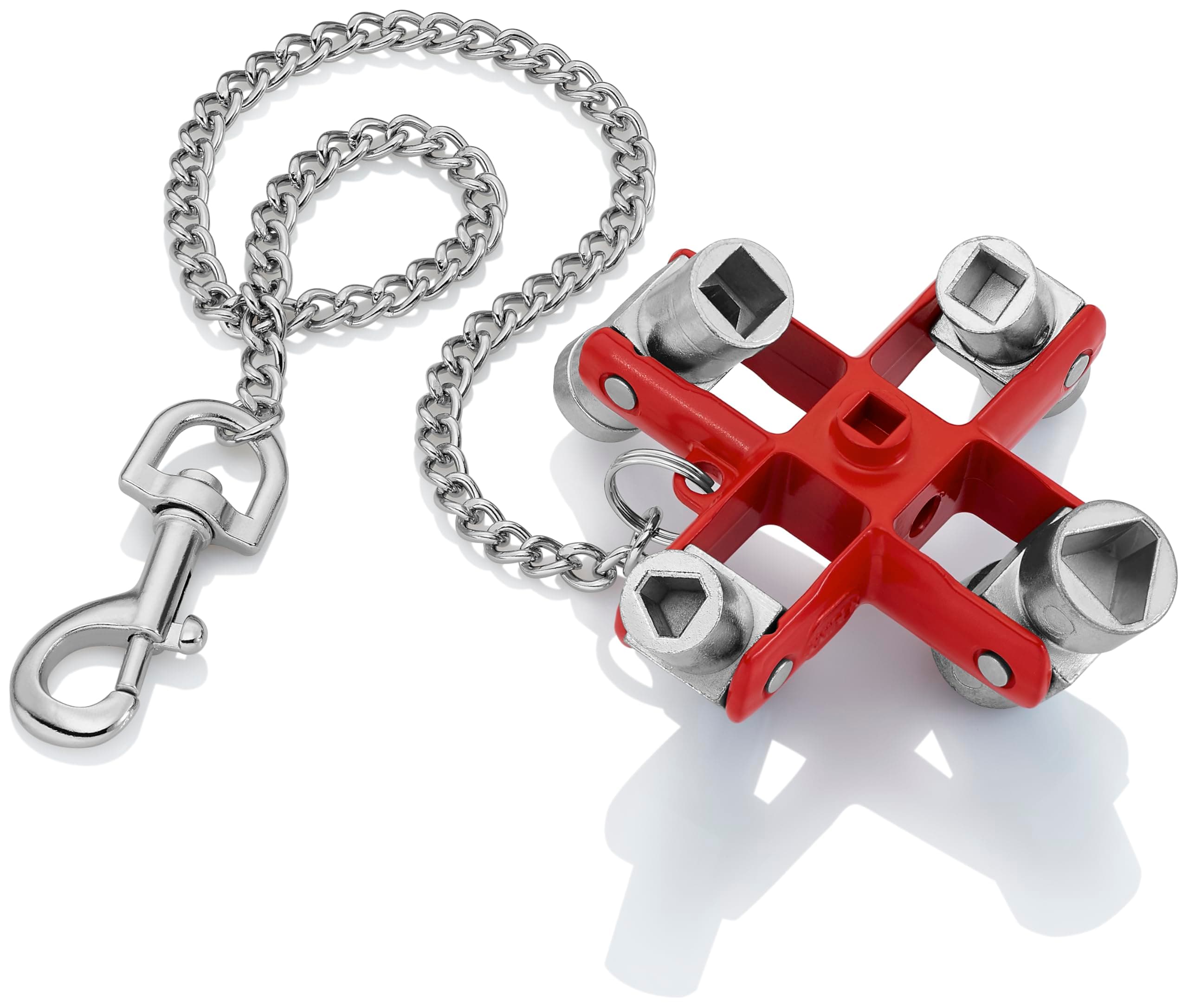 The KNIPEX 00 11 06 Universal Control Cabinet Key is a professional-grade tool featuring 9 die-cast zinc key profiles in one compact device. Designed for electrical, HVAC, gas, and water systems, it includes a detachable chain and snap hook for easy carrying and loss prevention. With a durable zinc die-cast body, REACH compliance, and a 12-month warranty, this red universal key is a must-have for fleet, plant, and building maintenance professionals.